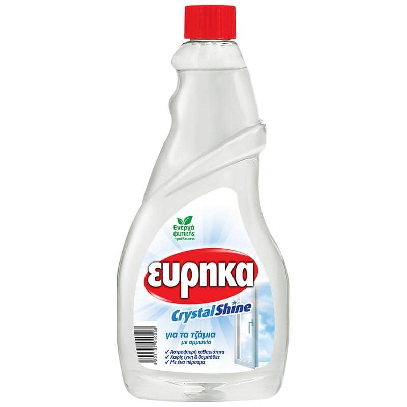 Τα υγρά καθαριστικά τζαμιών Εύρηκα Crystal & Blue Shine, τώρα με νέα, αποτελεσματικότερη σύνθεση, η οποία περιλαμβάνει ενεργά φυτικής προέλευσης, προσφέρουν αστραφτερή καθαριότητα & λάμψη με ένα πέρασμα! Στεγνώνουν πολύ γρήγορα χωρίς να αφήνουν ίχνη και θαμπάδες. Απαλλαγείτε στη στιγμή, χωρίς κόπο, από τη λιπαρή βρωμιά που προκαλούν η σκόνη, το καυσαέριο και ο καπνός. Είναι κατάλληλα για χρήση σε τζάμια αλλά και σε όλες τις λείες επιφάνειες.