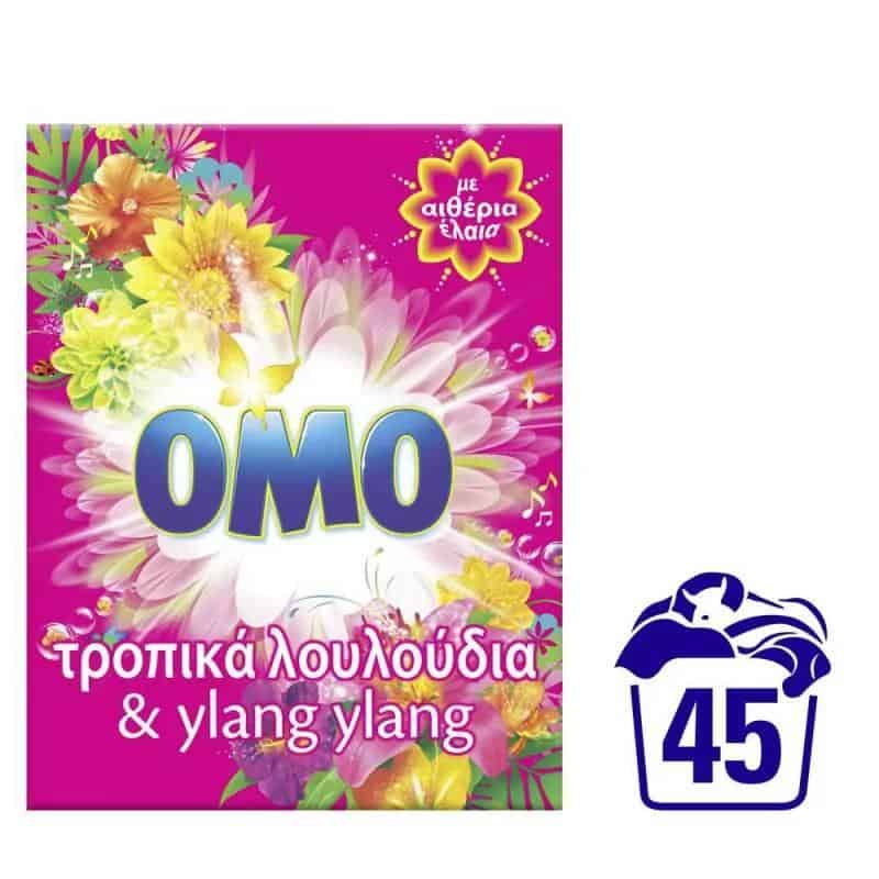 Το ΟΜΟ απορρυπαντικό σε σκόνη για το πλυντήριο ρούχων με Τροπικά Λουλούδια και Ylang Ylang χαρίζει ένα Άρωμα μαγευτικό με μεγάλη διάρκεια. Κάθε δόση χαρίζει εξαιρετική καθαριότητα δρώντας στην καρδιά της πλύσης, ενώ τα εμπλουτισμένα με αιθέρια έλαια αρώματα που περιέχει έχουν επιλεγεί ειδικά για να σας προσφέρουν ένα απολαυστικό ταξίδι αισθήσεων που φροντίζει εσάς και τα ρούχα σας.